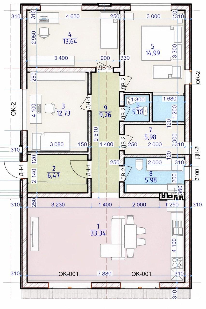 Проект включает кухню-гостиную, жилые комнаты, два санузла, и отдельное техническое помещение. При желании проект может быть дополнен террасой.