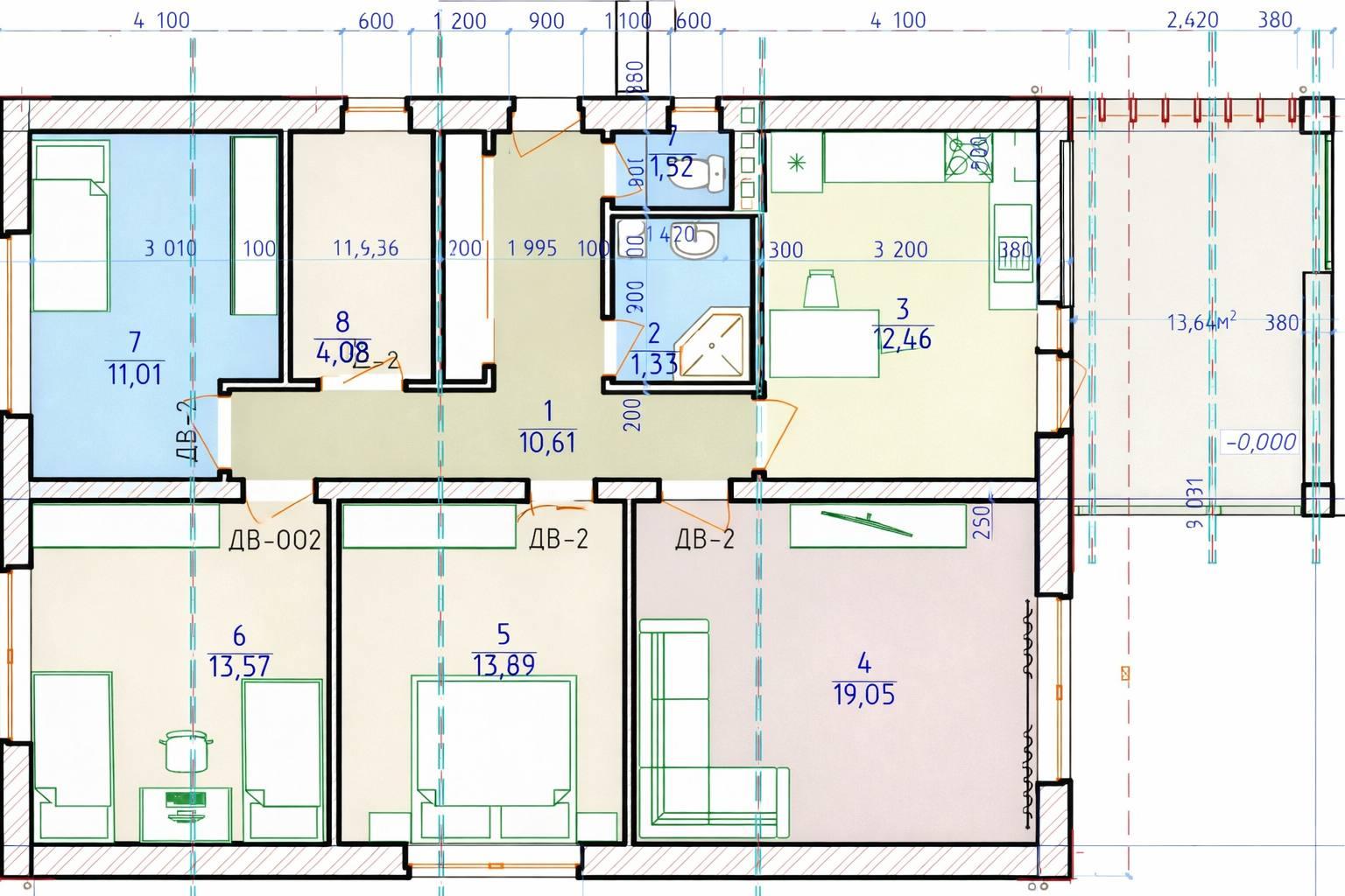 Планировка дома предусматривает отдельную гостиную, кухню, три изолированные спальни, два санузла, прихожую и техническое помещение. Такое решение обеспечивает удобство повседневной жизни, комфортное зонирование и приватность спальных комнат.